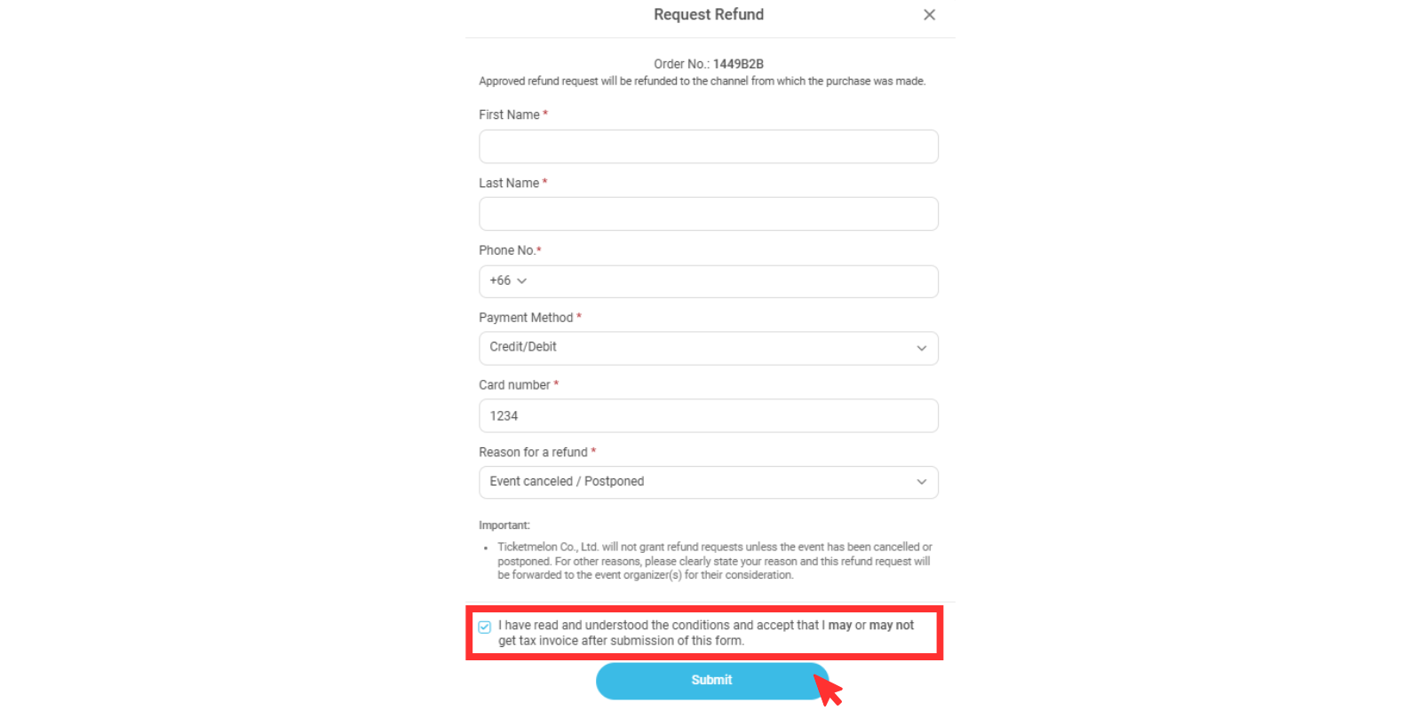 3. Review Ticketmelon's refund policies. After reading them, check the box to acknowledge the policies and then click "Continue"